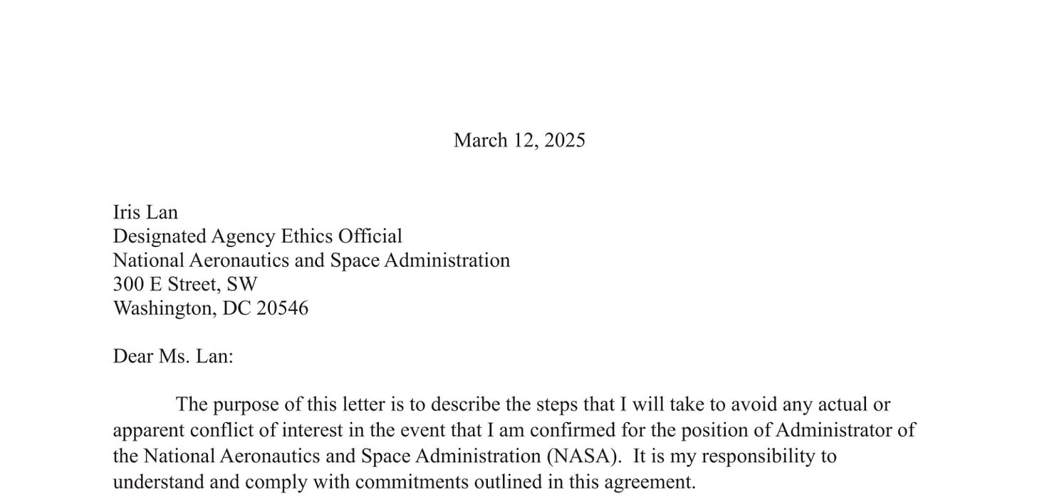 In a letter from Jared to Iris Lan, the Designated Agency Ethics Official at NASA, he described the steps he’s taken or is taking to “avoid any actual or apparent conflict of interest” if he is confirmed as the 15th NASA Administrator. The seven-page letter details his resignation from Shift4 Payments, 26 North Aviation, JDI Holdings and Bone Horse Hangars. It then lists entities that will “remain dormant and will not advertise”. These include Rook Holdings, Rook Aviation Holdings, Bone Horse Marine, RookX and Rook Space Investments.