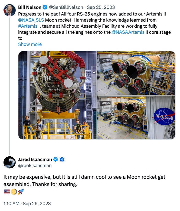 In another X post from September 2023, replying to then-NASA Administrator Bill Nelson on the topic of the construction of the Artemis-II SLS, Jared wrote, “It may be expensive, but it is still damn cool to see a Moon rocket get assembled”.