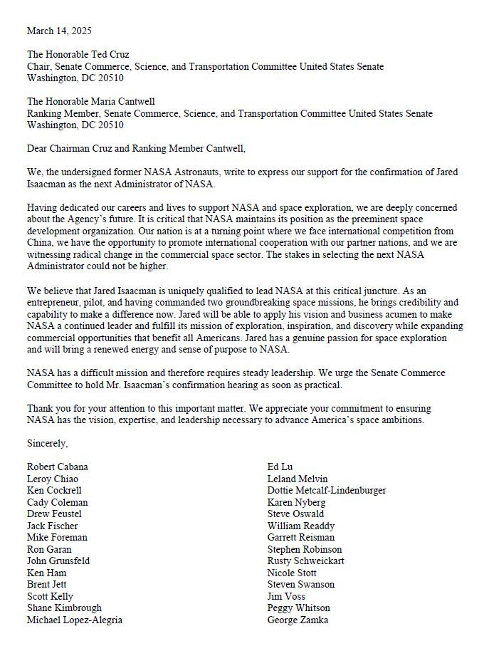 “Having dedicated our careers and lives to support NASA and space exploration, we are deeply concerned about the Agency's future. It is critical that NASA maintains its position as the preeminent space development organization […] We believe that Jared Isaacman is uniquely qualified to lead NASA at this critical juncture […] We urge the Senate Commerce Committee to hold Mr. Isaacman's confirmation hearing as soon as practical.”